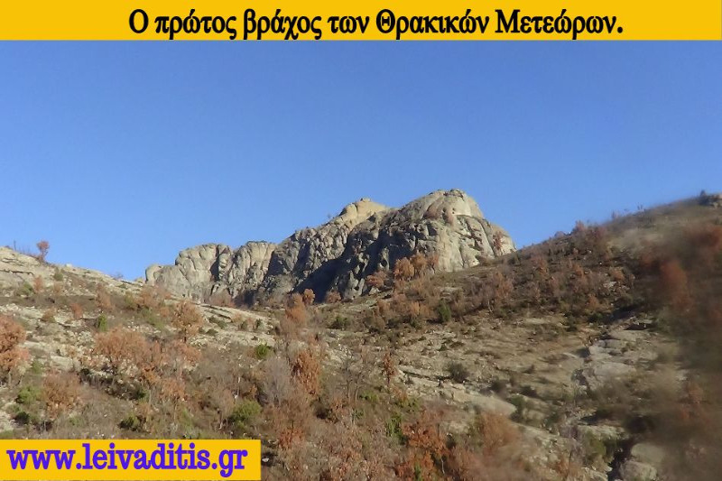 Μόλις περάσετε την πλαγιά συνεχίζετε τη διαδρομή η οποία στην αρχή είναι αρκετά απότομη, στη συνέχεια όμως γίνεται πιο ομαλή και για τα επόμενα 2,2 χλμ δηλαδή 50 λεπτά περίπου περπατήματος σας οδηγεί στο πρώτο βράχο των Θρακικών Μετεώρων σε υψόμετρο 380 μ. (Εικόνα 7)...