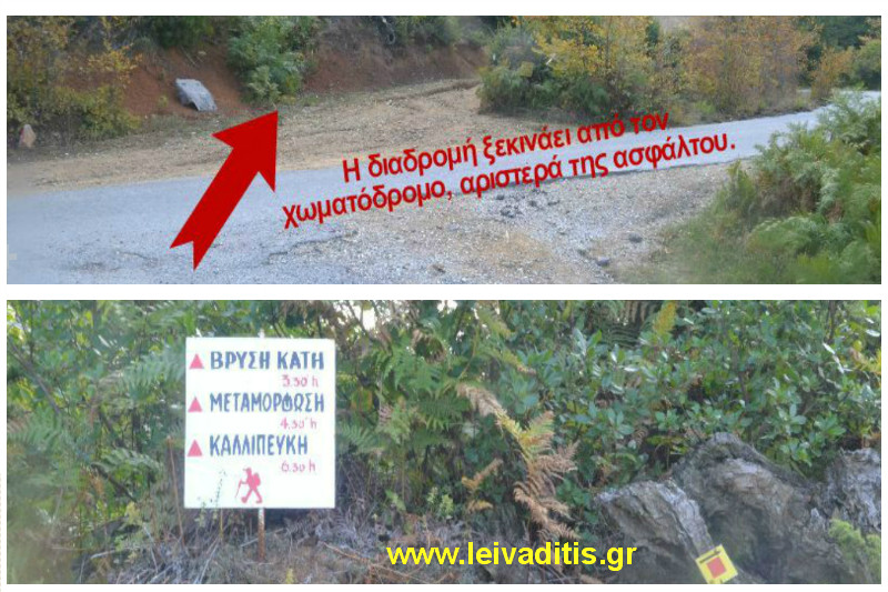 Η διαδρομή ξεκινάει από τον χωματόδρομο που υπάρχει ακριβώς απέναντι από την θέση που παρκάρετε το αυτοκίνητό σας. Στην είσοδο του χωματόδρομου υπάρχει και ταμπέλα που σας ενημερώνει για προορισμούς και διάρκεια πεζοπορίας (Εικόνα 2)...