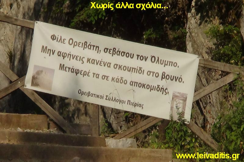 Έφτασε η ώρα λοιπόν για να ξεκινήσετε το περπάτημα. Κατευθείαν και πολύ σωστά ένα πανό σας βάζει να σκεφτείτε και να μην ξεχάσετε την προστασία του Ολύμπου που είναι ο πιο παλιός Εθνικός δρυμός (από το 1938) (Εικόνα 2)....