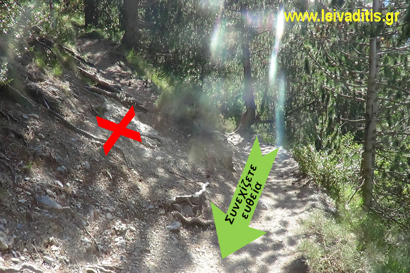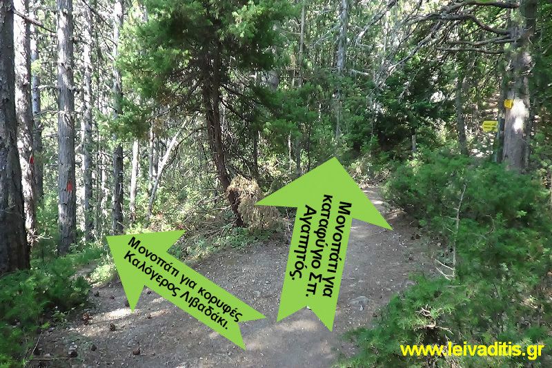 Μετά το παγκάκι 200 μέτρα σε υψόμετρο 1.380 μέτρων θα συναντήσετε διασταύρωση στο αριστερό σας χέρι η οποία οδηγεί στις κορυφές Καλόγερο και Λιβαδάκι. Δεν την δίνετε σημασία. Συνεχίζετε ευθεία (δεξιά) πάνω στο μονοπάτι (Εικόνα 5)...