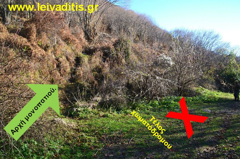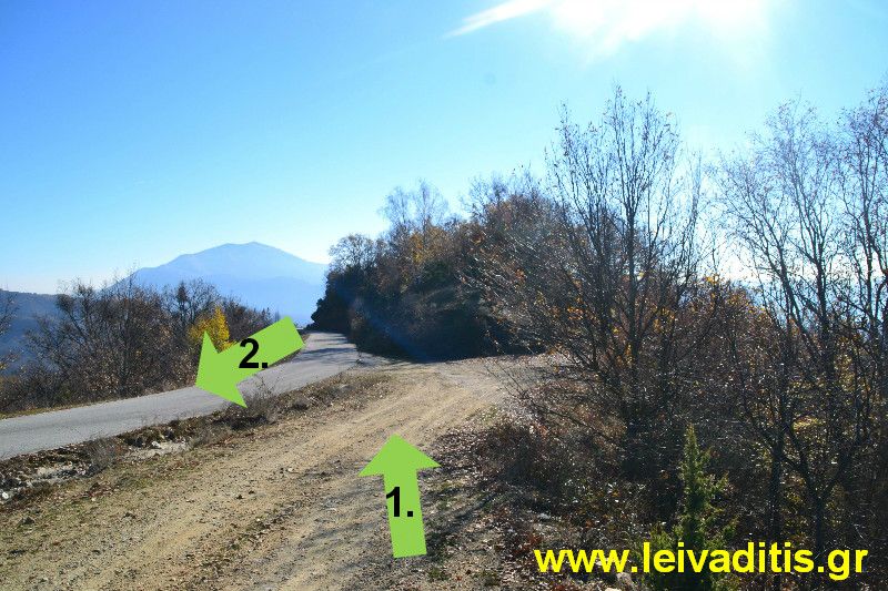 Έχετε ξεκινήσει λοιπόν μέσα από το χωριό του Λειβαδίτη και έχετε περπατήσει μέχρι τώρα 4 χιλιόμετρα και 500 μέτρα σε 1 ώρα και 20 λεπτά. Μόλις φτάσετε στην θέση θέας θα δείτε ότι ξεκινάει από εκείνο το σημείο αγροτικός δρόμος, ο οποίος μετά από 250 μέτρα οδηγεί σε ένα μαντρί που τους καλοκαιρινούς μήνες φιλοξενεί κοπάδι από πρόβατα και κατσίκια. Γι αυτό θα πρέπει να προσέχετε τα σκυλιά όταν θα περνάτε από εκείνο το σημείο. Αφού το περάσετε και περπατήσετε άλλα 250 μέτρα πάνω σε παλιό αγροτικό δρόμο που θυμίζει περισσότερο μονοπάτι, θα βρείτε την είσοδο του μονοπατιού στο αριστερό σας χέρι.