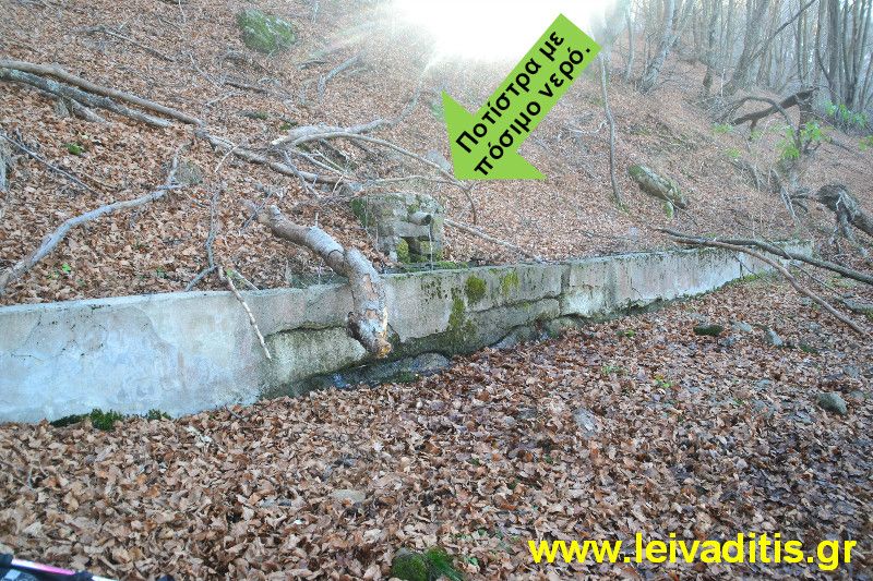 Ακολουθείτε το μονοπάτι για 1 χιλιόμετρο και 600 μέτρα. Στην αρχή μπορεί να δυσκολευτείτε να το βρείτε λόγω των μεγάλων και ψηλών φυτών φτέρης που υπάρχουν στην αρχή (και αναφερόμαστε για την περίοδο Ιουνίου - Σεπτεμβρίου) αλλά στην συνέχεια το μονοπάτι καθαρίζει και μπορείτε να προχωρήσετε χωρίς άλλα προβλήματα. Έτσι λοιπόν φτάνετε μετά από 40 λεπτά στην μόνη ποτίστρα της διαδρομής με τρεχούμενο, πόσιμο νερό σε υψόμετρο 1.100 μέτρων.