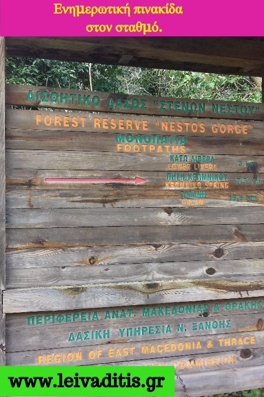Με το που θα κατέβετε στον σταθμό που βρίσκεται σε υψόμετρο 65 μ. και κάποτε λειτουργούσε και ως ξενώνας, κατευθείαν θα συναντήσετε πινακίδα που θα σας λέει στοιχεία της διαδρομής και ποιά κατεύθυνση θα πρέπει να ακολουθήσετε για να βγείτε στον οικισμό των "Κάτω Λιβερών" (Εικόνα 2)...