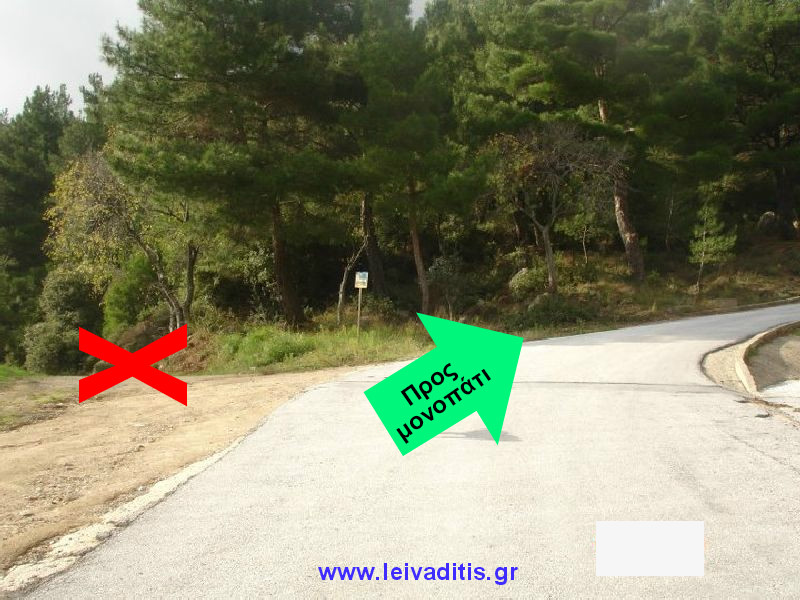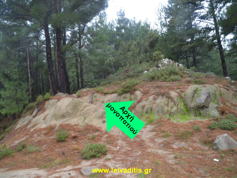 Ακολουθείτε τον τσιμεντένιο δρόμο που ανηφορίζει και πάει πάνω από την Εκκλησιαστική σχολή... και ο οποίος μετατρέπεται σε χωματόδρομο.Μετά από 350 μέτρα (δηλαδή στο τέλος του χωματόδρομου) ή 7 λεπτά περπατήματος (270 μέτρα υψόμετρο) σας οδηγεί σε μιά αλάνα (γήπεδο) από την οποία ξεκινάει το μονοπάτι.