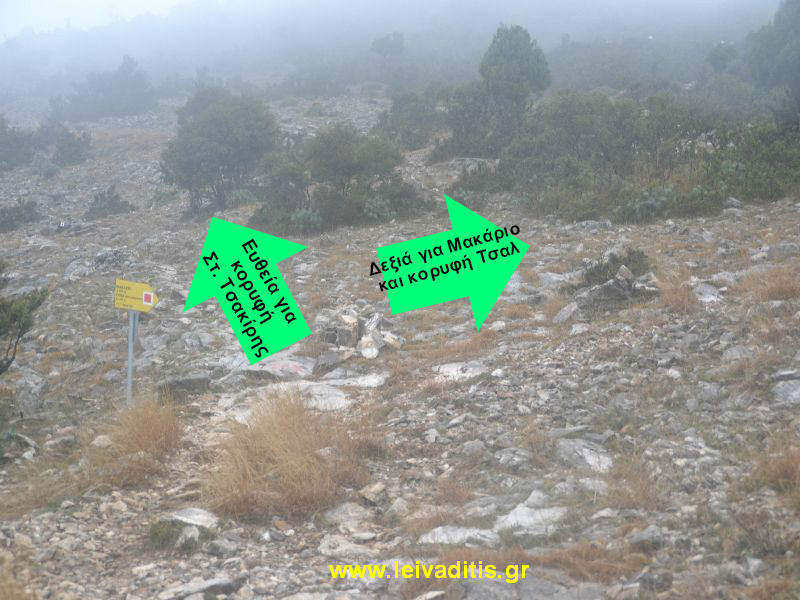 Μετά από 330 μέτρα (περίπου 7 λεπτά) και σε υψόμετρο 480 μέτρων θα συναντήσετε διασταύρωση μονοπατιών, τα οποία με ταμπέλα σας ενημερώνουν ότι το δεξιό μονοπάτι οδηγεί στον οικισμό του Μακάριου και από κει στην κορυφή του Τσαλ, ενώ αριστερά (ευθεία) συνεχίζετε, για να φτάσετε στην κορυφή Στ. Τσακίρης. Είστε περίπου στη μέση της διαδρομής σε υψόμετρο 480 μέτρων και έχετε περπατήσει 1 χιλιόμετρο και 630 μέτρα από την εκκλησιαστική σε 37 λεπτά.