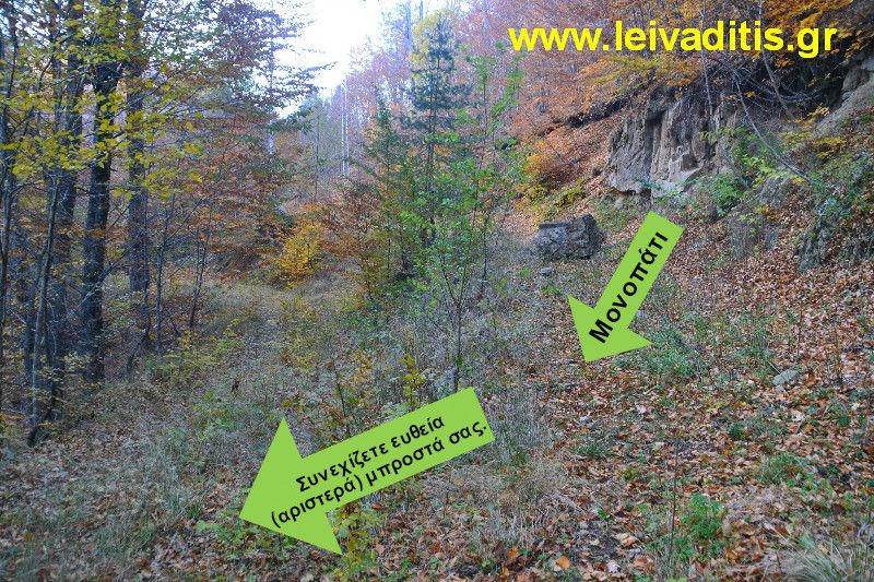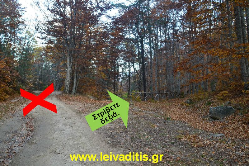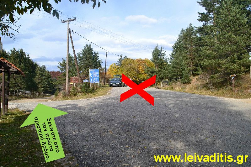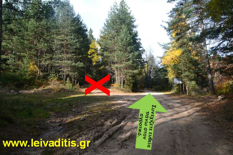 Στα 500 περίπου μέτρα και σε υψόμετρο 1.310 μέτρων θα συναντήσετε διασταύρωση στο αριστερό σας χέρι. Δεν στρίβετε αριστερά αλλά συνεχίζετε ευθεία.