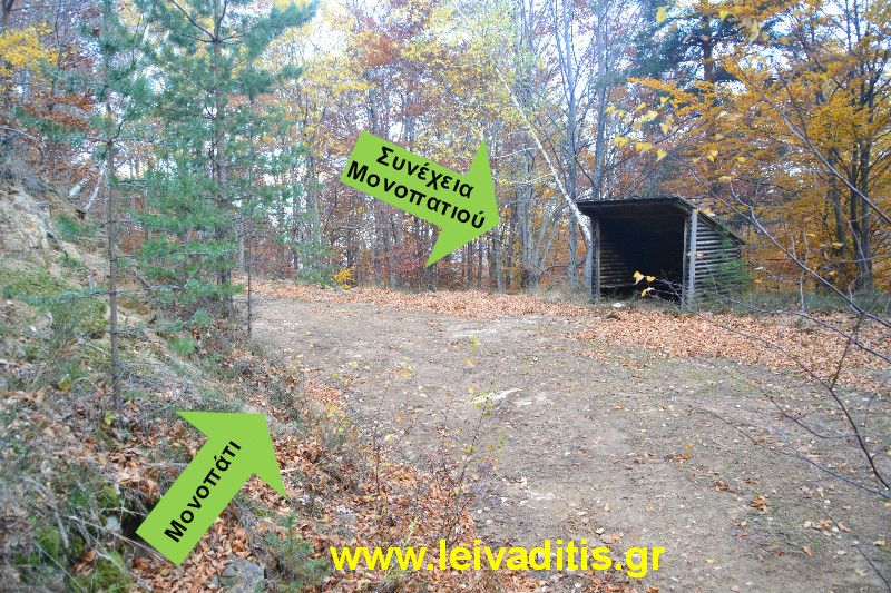 Ακολουθείτε το μονοπάτι για άλλο 1 χιλιόμετρο και 70 μέτρα και σε περίπου 20 λεπτά φτάνετε σε αγροτικό δρόμο στον οποίο υπάρχει ένα ξύλινο σπιτάκι σε υψόμετρο 1.220 μέτρων. Διασχίζετε κάθετα τον δρόμο και θα διαπιστώσετε ότι αριστερά από το σπιτάκι συνεχίζει το μονοπάτι.