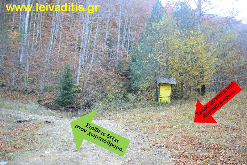 Αφού περπατήσετε άλλα 230 μέτρα μετά την διασταύρωση και σε υψόμετρο 1.310 μ. (έχετε περπατήσει ήδη 730 μέτρα σε 12 λεπτά) θα συναντήσετε κιόσκι και ξύλινα κάγκελα στο δεξί σας χέρι με μια ταμπέλα που σας ενημερώνει ότι από εκεί ξεκινάει το μονοπάτι "Κερασοχωρίου".