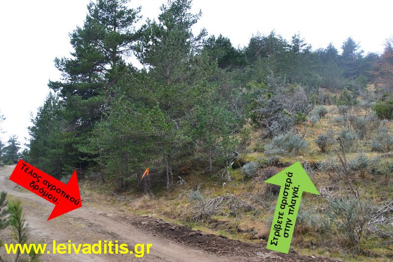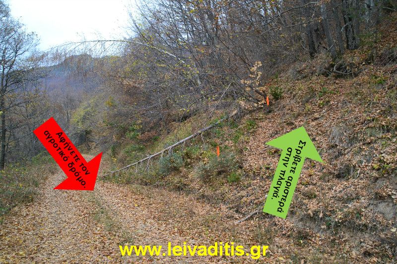 100 μέτρα μετά, σε υψόμετρο 1.200 μέτρων και αφού περπατήσετε μια δεξιά στροφή που κάνει ο δρόμος, τον εγκαταλείπετε και στρίβετε σε πλαγιά στο αριστερό σας χέρι σε εκείνο το σημείο όπου υπάρχουν πορτοκαλί πανάκια και λίγο πιο πάνω θα δείτε ταινίες σημάνσεως. Ας συνοψίσουμε όμως μέχρι τώρα τι έχετε κάνει: Ξεκινήσατε από υψόμετρο 1.315 μέτρων, κατεβήκατε στα 1.085 και μέχρι στιγμής αρχίσατε να ανεβαίνετε και έχετε φτάσει ήδη στα 1.200. Χρειαστήκατε 1 ώρα και 25 λεπτά και περπατήσατε συνολικά 5 χιλιόμετρα και 450 μέτρα (3 χιλιόμετρα και 30 μέτρα αγροτικού δρόμου και 2 χιλιόμετρα και 420 μέτρα μονοπατιού). Από δω και πέρα όμως αρχίζουν τα δύκολα. Υπομονή...Ξεκινάτε!!!
