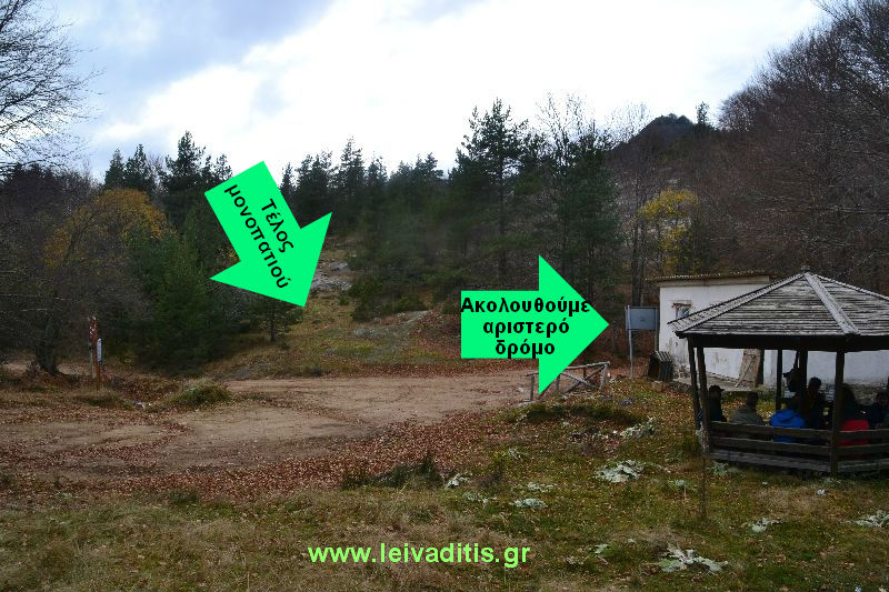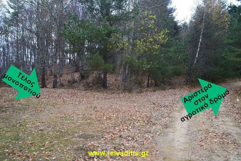 Ακολουθείστε το μονοπάτι λοιπόν που υπάρχει (στην αρχή θα περάσετε και μια δεξαμενή) και αφού περπατήσετε 1.400 μέτρα και σε υψόμετρο 1.485μ.(μετά από 25 λεπτά), το μονοπάτι βγάζει σε νέο χωματόδρομο. Όλη η διαδρομή είναι μέσα σε δάσος οξιάς με πολύ ωραία δροσιά το καλοκαίρι και πλούσιο φύλλωμα το φθινόπωρο και τον χειμώνα πάνω στο μονοπάτι. Μόλις φτάσετε στον δρόμο, στρίβετε αριστερά και περπατάτε για άλλα 300 μέτρα, περίπου 5 λεπτά.