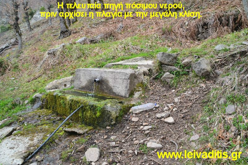 Όπως είπαμε και νωρίτερα από την ώρα που ξεκινάει το μονοπάτι και για τα επόμενα 2,2 χιλιόμετρα έχετε την ευκαιρία να θαυμάσετε την ομορφιά της περιοχής. Σε κάποιο σημείο λοιπόν και αφού περπατήσατε περίπου 55 λεπτά πάνω στο μοναπάτι συναντάτε βρύση με τρεχούμενο πόσιμο νερό σε υψόμετρο 970 μέτρων. Δώστε προσοχή όμως σε αυτή την πηγή διότι είναι η τελευταία πριν αρχίσει η δύσκολη και μακρυά ανάβαση για την κορυφή και δεν θα δείτε άλλη σύντομα παρά αρκετές ώρες αργότερα και αφού φτάσετε στο μέσον της κατάβασής σας.