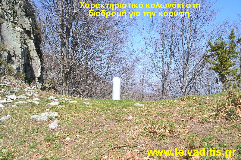 Από την πηγή και μετά πρέπει να ανέβετε την πλαγιά που υπάρχει ακριβώς από επάνω σας και να ακολουθήστε την διαδρομή πάνω στην κορυφογραμμή. Εδώ πρέπει να πούμε ότι υπάρχουν κόκκινα σημάδια πάνω σε δέντρα, αλλά είνα πολύ αχνά και μακρυά το ένα με το άλλο οπότε θα πρέπει να είστε προσεκτικοί κατά τον εντοπισμό τους και να συμβουλεύεστε πάντα την διαδρομή που σας δίνουμε για το gps σας ή το κινητό σας μέσω της σελίδας του wikiloc. Συνεχίζετε λοιπόν πάνω στην κορυφογραμμή η οποία μόλις τελειώσει δίνει την θέση της σε έναν λόφο τον οποίο μόλις ανέβετε θα αρχίσετε να βλέπετε από μακρυά την πολυπόθητη κορυφή.