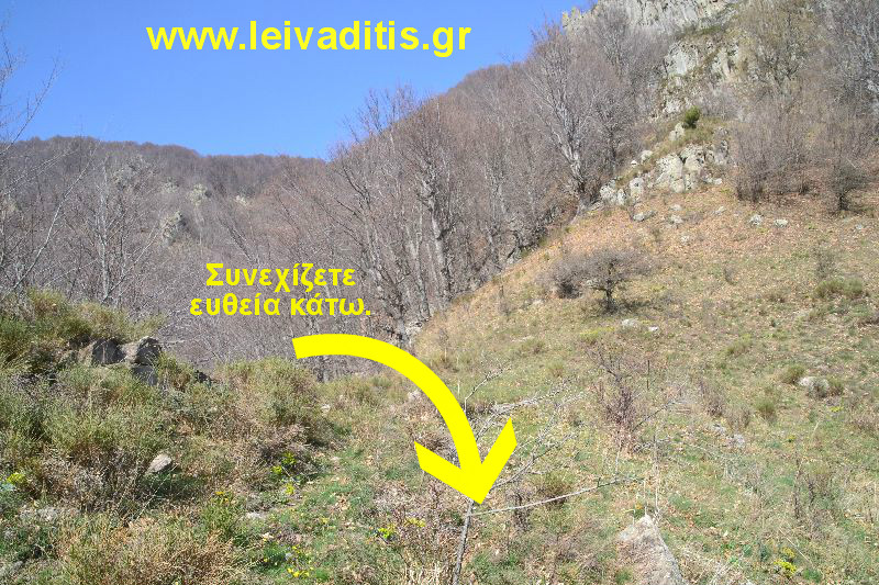 Πρέπει να δώσετε προσοχή στην μεγάλη κλίση που έχουν οι πλαγιές που πρέπει να κατέβετε για να ακολουθήστε το ρέμα. Για το επόμενο 1,5 χιλιόμετρο θα πρέπει να προσέχετε πολύ γιατί θα πρέπει να έχετε το νου σας και να βρείτε τα σημάδια αλλά και να κατεβαίνετε με ασφάλεια (χωρίς τραυματισμούς). Θα σας πάρει περίπου 50 λεπτά για να περάσετε αυτό το επικύνδυνο σημείο. Κάποια στιγμή τα σημάδια σταματάνε αλλά εσείς συνεχίζετε και κατεβαίνετε ευθεία κάτω. Μπροστά σας εξάλλου αρχίζουν και φαίνονται λιβάδια και οι στάνες των τσοπάνων της περιοχής και εκεί θέλετε να καταλήξετε και εσείς προκειμένου να φτάσετε στον αγροτικό δρόμο που θα σας οδηγήσει πίσω στον οικισμό της Πάχνης.