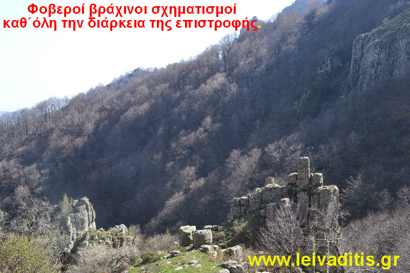 Αφού ξεκουραστείτε λοιπόν έρχετε η ώρα της επιστροφής. Αν θέλετε γυρίζετε από την ίδια διαδρομή που ήρθατε αν σας φαίνετε πιο ασφαλής, διαφορετικά μπορείτε να επιστρέψετε από την διαδρομή που σας προτείνουμε. Ακολουθείτε τα σημάδια που φεύγουν αριστερά από το ορόσημο (βλέποντας μπροστά σας το Γυφτόκαστρο). Κατεβαίνετε την πλαγιά μέχρι που να ακούσετε και να δείτε ρέμα μέσα στην χαράδρα. Έχετε την ευκαιρία ταυτόχρονα να θαυμάστε και άλλο έργο της Φύσης.