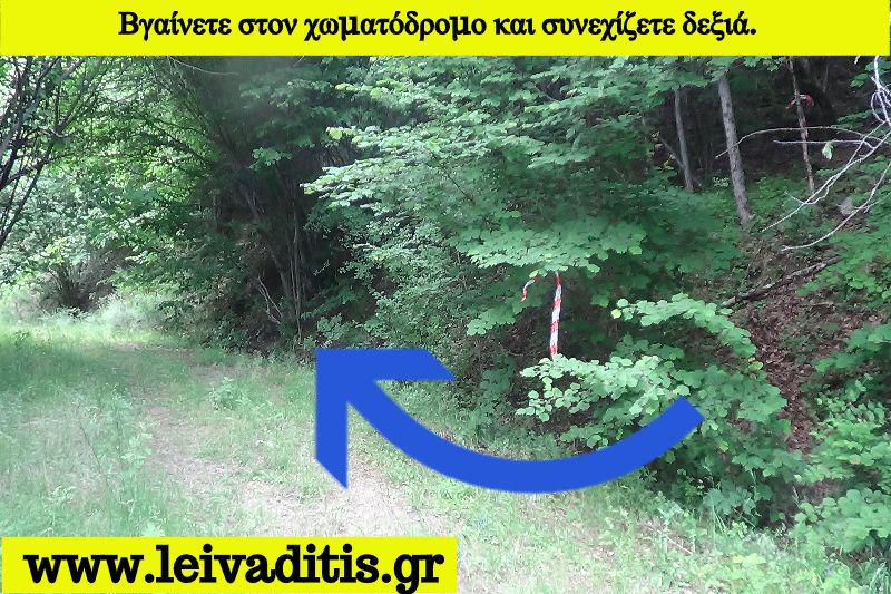 Αφού περάσετε λοιπόν και την φάρμα προχωράτε άλλα 350 μέτρα πάνω στον χωματόδρομο και μετά το περιφραγμένο χωράφι που θα δείτε στην αριστερή μεριά του δρόμου μπαίνετε στο μονοπάτι του Μηνά την τελευταία πράξη του σημερινού "δράματος". Το μονοπάτι έχει συνολικό ανάπτυγμα 2,2 χιλιόμετρα και μετά από 55 λεπτά σας οδηγεί μέσα στον ορεινό οικισμό του Λειβαδίτη σε υψόμετρο 1.240 μέτρων (Εικόνα 22)...