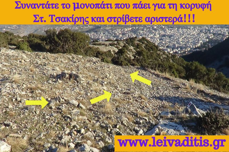 Συνεχίζετε πάνω στο μονοπάτι για άλλο 2 χιλιόμετρα και σε 40 λεπτά (σε υψόμετρο 480 μέτρων) φτάνετε σε διασταύρωση με το κλσικό μονοπάτι που ανεβαίνει στην κορυφή Στ. Τσακίρης και που έρχεται από την Εκκλησιαστική Σχολή. Στρίβετε αριστερά (κάτω) και συνεχίζετε το περπάτημά σας (Εικόνα 19)...