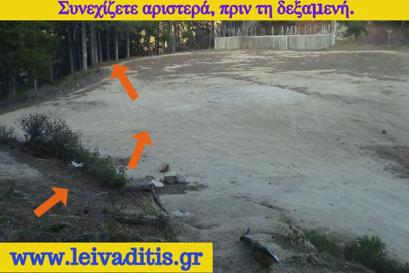 Στο επόμενο χιλιόμετρο, περίπου 15 λεπτά, τελειώνει το μονοπάτι και οδηγεί σε ένα χώρο σαν γήπεδο που στο βάθος έχει μια δεξαμενή. Όταν φτάσετε στην δεξαμενή θα δείτε αριστερά σας νέο μονοπάτι το οποίο πρέπει να ακολουθήσετε για να φτάσετε στο παρκινγκ της Καφετέριας - Εσταιατόριο "Ξανθίππη" (Εικόνα 20)...