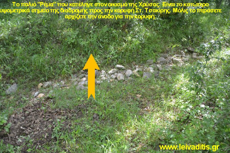 Από την παράγκα και μετά συνεχίζετε κατηφορικά (όχι προς την Ξάνθη, αλλά κινήστε πάνω κάτω στην ίδια ευθεία με την παράγκα) μέχρι να συναντήσετε το παλιό Ρέμα που κατεβαίνει στην Χρύσα και που κάποτε ήταν το μονοπάτι που αρκετός κόσμος χρησιμοποιούσε για να ανέβει στην κορυφή "Στ. Τσακίρης" (γνωστή τότε με την ονομασία "Αβγό"). Μέχρι εδώ πάντως από την κορυφή της Τρύφαινας θα χρειαστεί να περπατήσετε 1,5 χιλιόμετρο σε 45 περίπου λεπτά και από το υψόμετρο των 648 μέτρων θα φτάσετε στο χαμηλότερο δηλαδή σε αυτό των 495 μέτρων (Εικόνα 13).