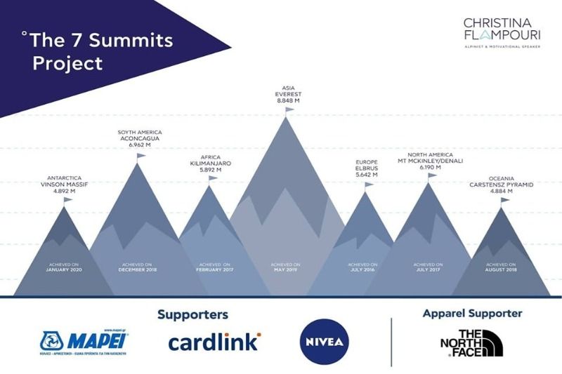 (Φ.Χ.): Η πρώτη κορυφή από την οποία ξεκίνησα το 7 Summits ήταν η Elbrus στον Καύκασο. Ένα βουνό χωρίς ιδιαίτερες τεχνικές δυσκολίες. Ήταν από τα πρώτα μου ψηλά βουνά, δεν ήμουν πολύ έμπειρη και πολλές φορές ανακαλώ στη μνήμη μου λάθη που έκανα και πόσες δυσκολίες έβλεπα που τώρα δεν μπορώ να τις καταλάβω. Όταν είχα πάει στο Elbrus επειδή φοβόμουνα το πολύ κρύο είχα την ημέρα της κορυφής φορέσει τόσα πολλά ρούχα όπου στην προσπάθεια να πάω προς τη κορυφή ίδρωνα μέσα από τα πολλά lays που είχα φορέσει. Ένα κλασικό λάθος πρωτάρη. Όταν έφτασα στην κορυφή το 7 Summits δεν ήταν στο μυαλό μου απλά ένιωσα ιδιαίτερη συγκίνηση, ένιωσα ότι είναι η αρχή μιας άλλης σελίδας στη ζωή μου. Λίγο καιρό μετά από εκείνη την κορυφή το 7 Summits μπήκε στο μυαλό μου και πιο συγκεκριμένα μετά την τρίτη κορυφή. Η δεύτερη κορυφή του 7 Summits ήταν το Κιλιμάντζαρο στην Αφρική και η τρίτη κορυφή ήταν το Denali στην Αλάσκα στην Βόρειο Αμερική. Όταν γύρισα από το Denali πλέον πίστεψα ότι έχω τη δυνατότητα να κάνω το 7 Summits γιατί τον πρώτο καιρό δεν το έλεγα ούτε στον εαυτό μου ότι θα ήθελα να ολοκληρώσω το 7 Summits θεωρούσα ότι ήταν ιεροσυλία για ένα νέο παιδί που τώρα ξεκινάει την ορειβασία να βάλει έναν τόσο υψηλό στόχο. Μετά το Denali την τρίτη μου κορυφή είπα ότι το 7 Summits πρέπει να γίνει πραγματικότητα, είναι ένα όνειρο που πρέπει να το καταφέρω και πρέπει να πάρω αυτοπεποίθηση και να συνεχίσω να δουλεύω γι αυτό. Μετά το Denali ήρθε η Κάρστενζ Πύραμιντ στην Παπαούα η ψηλότερη κορυφή της Ωκεανίας, στη συνέχεια η ψηλότερη κορυφή της Ν. Αμερικής το Ακονκάγκουα στις Άνδεις, στην Αργεντινή. Τον προηγούμενο Μάιο ήμουν στο Έβερεστ στην ψηλότερη κορυφή της Ασίας και του κόσμου όλου και 6 Γενάρη του 2020 πάτησα στην ψηλότερη κορυφή της Ανταρκτικής και έτσι ολοκληρώθηκε το project.