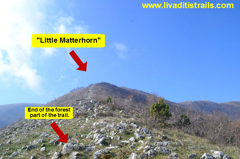 2 km later at an altitude of 890 meters from where you have parked your cars and in about 1/1,5 hours (an hour and a half) you will have crossed the forest part of the trail. You finally have in front of the clear horizon; so, what do you see? The ascent that lays straight ahead. The last edge, which was named “Little Matterhorn”, may be even harder. It winks at you and dares you to make a final exceedance (Picture 8)...