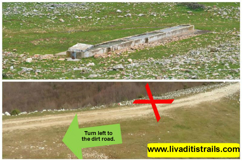 For the next hour and a half, the path is descending with great slope on rocky terrain. You descend to 590 meters and you have walked 4 km and 720 meters. You will come across the country road which comes from the settlement of Pillima and ends up to a pen at the settlement of Makario (Makaklar). At the crossroad, you will see the only water trough on the path with running water. Turn left and continue walking on the country road (Picture 15)...