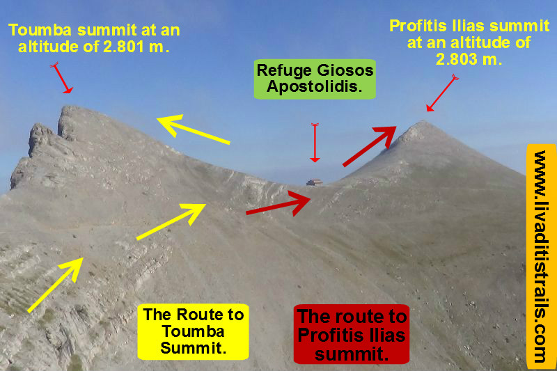After crossing the Louki of Mytikas and come across for the first time the “Plateau of Muses”, walk for 1 km in about 20 minutes, passing right below the “Stefani of Zeus” to end up right next to the Giosos Apostolidis refuge on the left. Don’t get close; go up the hill in front of you (500 meters) and after 20 minutes you will reach the “Toumpa” summit at an altitude of 2.801 m (Image 9)…