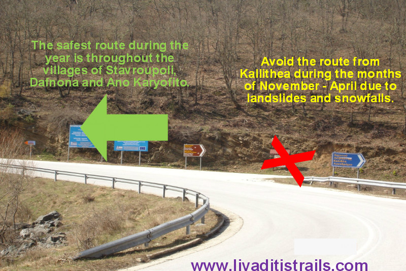 Starting from the city of Xanthi, you could follow the road to the small town of Stavroupoli and then after passing the villages of Dafnona and Ano Karyofito you end up, after a distance of 48 km in the mountain village of Livaditi at an altitude of 1.250 meters. While you are on your way to Stavroupoli and more specifically at the height of Lykodromio at an altitude of 285 meters, you will notice that there is a right junction, which ends up in the village of Livaditi through Kallithea. It is advisable to avoid this route during the months of November to April, because due to frequent snowfalls the route closes and it is difficult to get to your destination (this road is of minor importance and during the winter season snow removal equipment is not available). Also, there is no telephone signal all the way, just on a few points. This particular route is far more pleasant to be followed during the other months, from May to October.