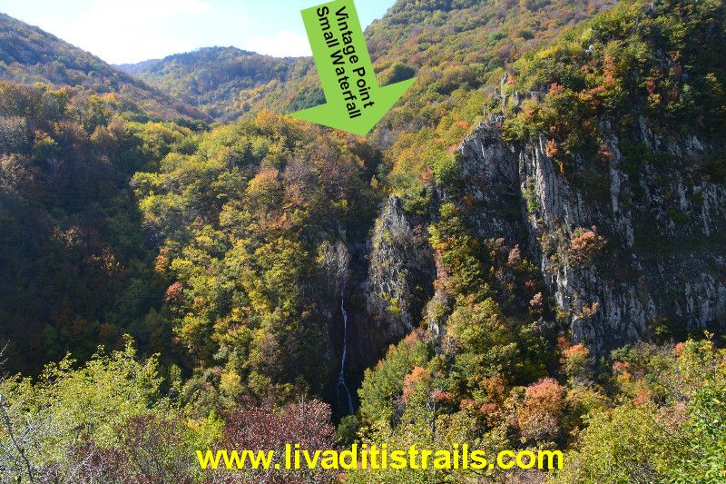 From there you can admire a smaller waterfall, whose water comes from the streams of Livaditi and a little further from there that "pops", it meets with the waters from the streams of "Stravorema", thus forming an impressive spectacle that the big waterfall gives. Also behind you, you can look at the tops of the mountains belonging to the country of Drama.